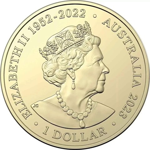 6th crowned portrait of HM Queen Elizabeth II facing right (the Commonwealth effigy), wearing the George IV State Diadem, the Coronation Necklace and Earrings framed by inscriptions “ELIZABETH II,” "the dates of the Queen's reign 1952 - 2022," “AUSTRALIA, 2023,” and the face value “1 DOLLAR.”