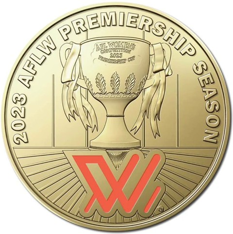 coin’s reverse design illustrates the intricate engraving captures the elegance and grandeur of the AFL WOMENS trophy (Created by Cash's Awards in Frankston, Victoria), from its graceful handles to the meticulously etched detailing that symbolizes the essence of triumph. Colored AFL Logo below (a stylized rendition of an Australian rules football ground goal square and goal posts, drawn from a perspective that resembles a "W"). The inscription accompanied date - coin name - "2023 AFLW PREMIERSHIP SEASON" around above.