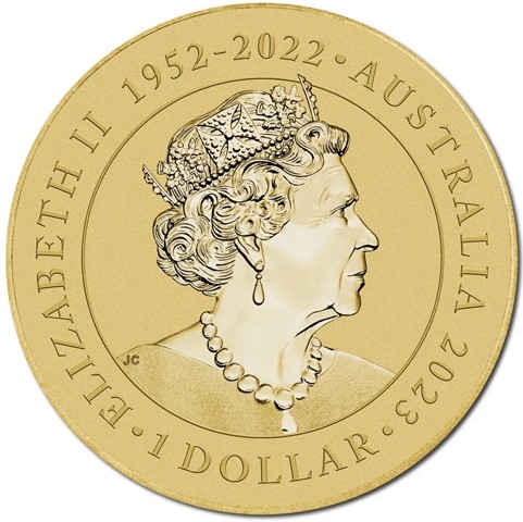 6th crowned portrait of HM Queen Elizabeth II facing right (the Commonwealth effigy), wearing the George IV State Diadem, the Coronation Necklace and Earrings framed by inscriptions “ELIZABETH II,” "the dates of the Queen's reign 1952 - 2022, AUSTRALIA,” and the face value “1 DOLLAR.”