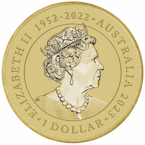 6th crowned portrait of HM Queen Elizabeth II facing right (the Commonwealth effigy), wearing the George IV State Diadem, the Coronation Necklace and Earrings framed by inscriptions “ELIZABETH II,” "the dates of the Queen's reign 1952 - 2022," “AUSTRALIA, 2023,” and the face value “1 DOLLAR.”