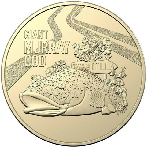 coin’s reverse design illustrates the Giant Murray Cod sculpture (Residing within the city of Swan Hill) stands as a tribute to the iconic indigenous fish. it serves as a representation of civic pride, and a poignant reminder of the diminishing numbers of this once-abundant species in the Murray-Darling River system. On a sign behind, the location city "SWAN HILL." On the right, the inscription - coin name - "GIANT MURRAY COD."
