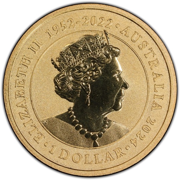 6th crowned portrait of HM Queen Elizabeth II facing right (the Commonwealth effigy), wearing the George IV State Diadem, the Coronation Necklace and Earrings framed by inscriptions “ELIZABETH II,” "the dates of the Queen's reign 1952 - 2022, AUSTRALIA, 2024” and the face value “1 DOLLAR.”