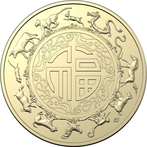 The reverse of the coin features the symbol for Fu "福" (happiness) surrounded by a lunar calendar wheel, will notice that each of the 12 animals in the cycle is represented in the design of the wheel. At the very top of the wheel, indicating it is the animal represented for the year, is a small tiger. The designer's initials (BK) are below left.