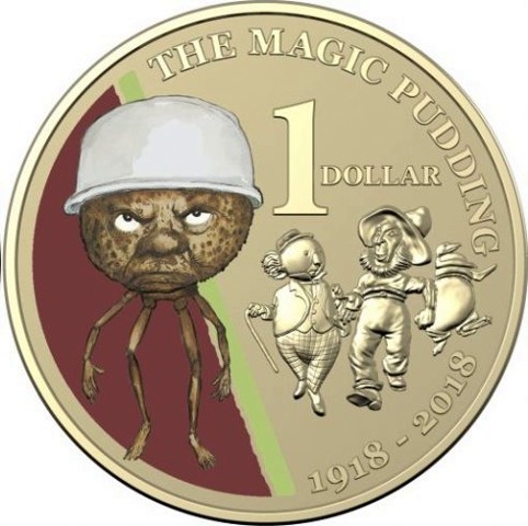 The coin reverse design features pad printed depiction of Albert the ill mannered pudding, to the right raised impressions ofBunyip Bluegum, Bill Barnacle & Sam Sawnoff. The inscription accompanied dates "THE MAGIC PUDDING 1918 - 2018" around the rim and the denomination above them.