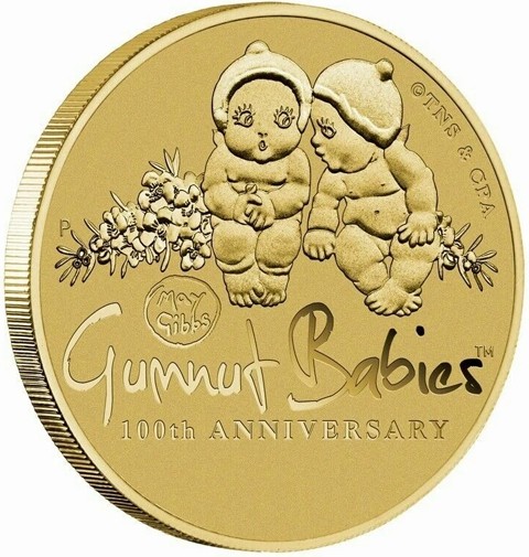 The reverse design features two Gumnut Babies sitting and talking amongst native flowers. The design includes the inscription "May Gibbs Gumnut Babies™’" "100th ANNIVERSARY," and The Perth Mint’s ‘P’ mintmark at the left side.