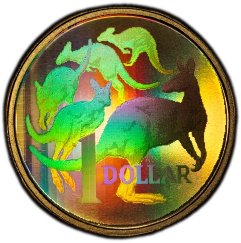 The reverse depicts five Holographic kangaroos (known as the Mob of Roos), the closest facing right but looking to left. Below, and overlaid on them, the denomination and face value "1 DOLLAR."