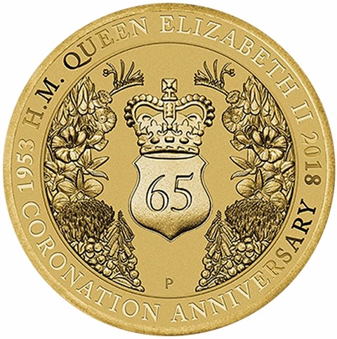 The reverse design features the St Edward's Crown atop a stylized shield with numeral "65" symbolized "65th Anniversary" and symbols of the British monarchy alongside representations of the floral emblem of Australia, the golden wattle, as well as the official flower of each Australian state and territory. The coin honors the deeply respected Queen’s record as the longest reigning monarch in British history. Inscriptions include: "H.M. QUEEN ELIZABETH II CORONATION ANNIVERSARY," "65," the year-dates "1953 - 2018," The Perth Mint's 'P' Mintmark and the designer's initials (NM) is inscribed next to it above "I" of ANNIVERSARY.