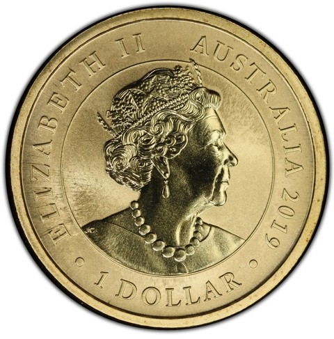 6th crowned portrait of HM Queen Elizabeth II facing right (the Commonwealth effigy), wearing the George IV State Diadem, the Coronation Necklace and Earrings framed by inscriptions “ELIZABETH II,” “AUSTRALIA, 2019,” and the face value “1 DOLLAR.”