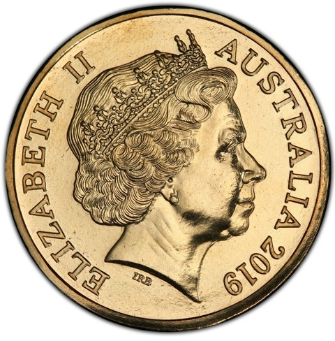 Fourth crowned portrait of HM Queen Elizabeth II facing right, wearing the Girls of Great Britain and Ireland tiara, framed by inscriptions ELIZABETH II, AUSTRALIA, and the coin's mintage year, "2019" below.