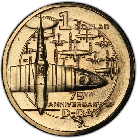The coins reverse features dozens of Supermarine Spitfire Mk with the extended "pointed" wing tips used by the high-altitude, cross the Channel above a fleet of ships with a kangaroo at the bottom of the image. The inscriptions identify the name of the series in two lines "75TH ANNIVERSARY OF D-DAY" below right and the face value "ONE DOLLAR" above . In the left field, the designer’s initials (BK) are behind aircraft.