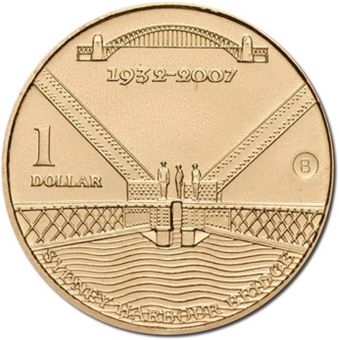 The reverse of the coin depicts three men standing on part of the joining of the two sides of the bridge dividing the the B (for Brisbane ) mint mark of the Royal Australian Mint right and denomination 1 DOLLAR left. There is also a Sydney Harbour Bridge from the northwest view above it with the dates underneath of year of building (1932) and year of issue (2007). It has the legend "SYDNEY HARBOUR BRIDGE".