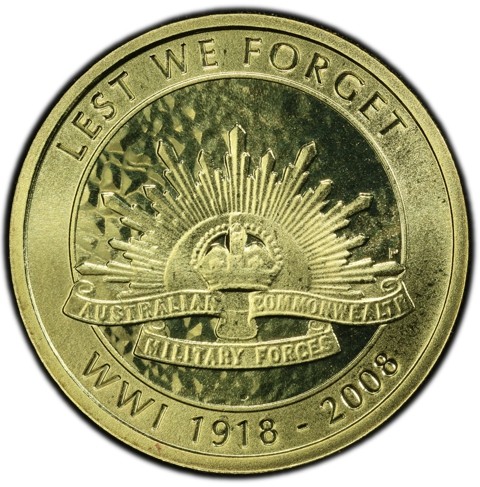 The reverse shows the the iconic 'Rising Sun' Australian Commonwealth badge, the background is textured like leather (The badge depicts the Imperial Crown and a banner with the words AUSTRALIAN COMMONWEALTH." and "AUSTRALIAN COMMONWEALTH". The 'sun rays' or rising sun are in fact not that at all, originally they were to depict a semi circle of thrusting swords and bayonets around the crown which in 1902 was to depict the co-operation between the navy (the swords) and the army (the bayonets) surrounded by inscription "LEST WE FORGET" around above and "WWI 1918-2008" around below. In the right field, The Perth Mint's "P" mint mark appears.