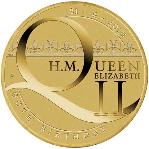 The reverse design features a stylized design of Her Majesty name in three lines with a large Q letter foreground the St Edward's Crown upper part. The date "21 - 4 - 2016" above right and the inscription identify theme "90TH BIRTHDAY" at the opposite. In the left field, the Perth Mint's mark, "P" appears and the designer's initials (NM) above it.