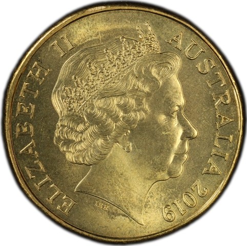 Fourth crowned portrait of HM Queen Elizabeth II facing right, wearing the Girls of Great Britain and Ireland tiara, framed by inscriptions ELIZABETH II, AUSTRALIA, and the coin's mintage year, "2019" below.