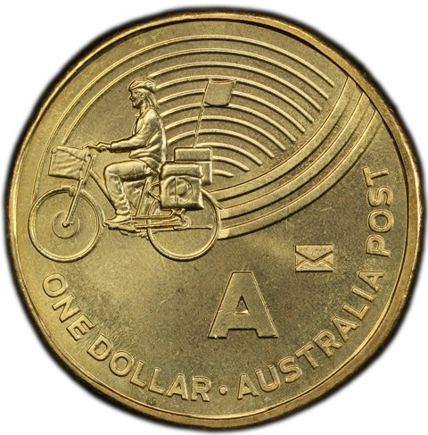 The reverse design capturing a postman on a bicycle working for Australia Post wearing a helmet with a bag above the front wheel, two saddlebags ,the Australian Postal Corporation logo depicts on one of them, and a flag on the rear of the bike. There are 11 thin concave lines with identical curvatures and 3 thick convex tracks with identical curvatures. A large letter "A" below, the denomination accompanied inscription identify theme "ONE DOLLAR . AUSTRALIA POST" around below. Australia Post privy mark in the form of an envelope, in the right field.