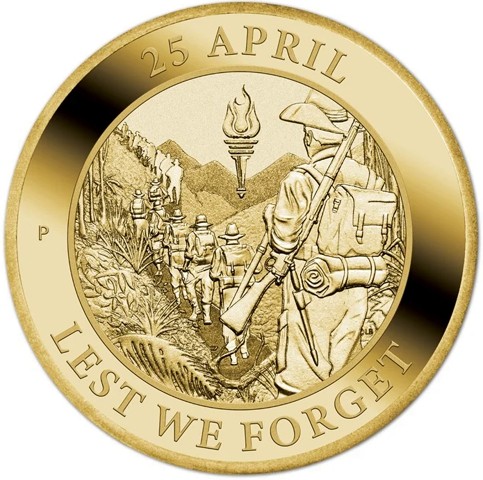 The coin reverse features Australian infantrymen moving up along the Kokoda track across the Owen Stanley Range with a stylized motif representing a flaming torch above. Also included in the design is the inscription "LEST WE FORGET" around below and the date of ANZAC Day, ‘April 25’ – a day on which we honor all those who gave their lives in the service of their country" around above. In the left field , the Perth Mint “P” mintmark and the designer's initials (LB) are in very small letters below right, opposite the T in FORGET..