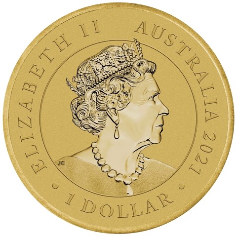 6th crowned portrait of HM Queen Elizabeth II facing right (the Commonwealth effigy), wearing the George IV State Diadem, the Coronation Necklace and Earrings framed by inscriptions ELIZABETH II, AUSTRALIA, the coin's mintage year, "2021" and the face value “1 DOLLAR” below.