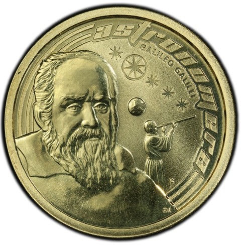 The reverse features a portrait of Galileo Galilei against a view of him pointed his telescope at Jupiter and his startling discovery (four "stars" surrounding Jupiter, he figured out that these "stars" were actually moons in orbit of Jupiter) his name around above right below inscription identify theme "astronomers". In the right below field , the Perth Mint “P” mintmark and the designer's initials (EM) appears below.