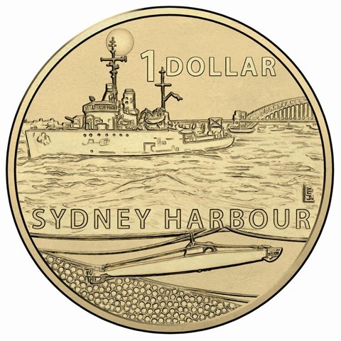 The reverse design capturing USS Chicago in Sydney Harbor at the time of the attack by Japanese submarines and composite midget submarine which share attacking Australia below water, Harbor Bridge in the background. The inscription identify theme "SYDNEY HARBOUR" below and face value "1 DOLLAR" above right, the designer's initials (EJ.L) at the right side also in the design.