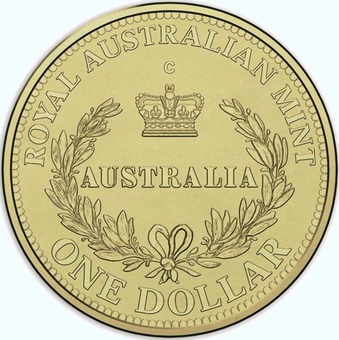 The coins' reverse emulate a Sydney Mint sovereign design (features St. Edwards crown along with a laurel wreath and the word AUSTRALIA — elements from the Leonard Charles Wyon original Type I Sovereign). Additional inscriptions read "ROYAL AUSTRALIAN MINT" around above and the denomination "ONE DOLLAR" around below. The C (for Canberra) mint mark of the Royal Australian Mint above the St. Edwards crown.