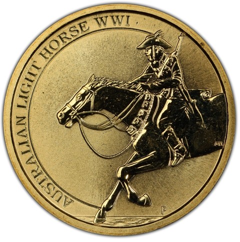 The coin design features a member of the Australian Light Horse charging on his horse. The design includes the inscription AUSTRALIAN LIGHT HORSE WWI" around the left side, along with The Perth Mint's 'P' Mintmark at the bottom and the designers initials “AH” feature in the horse abdomen.