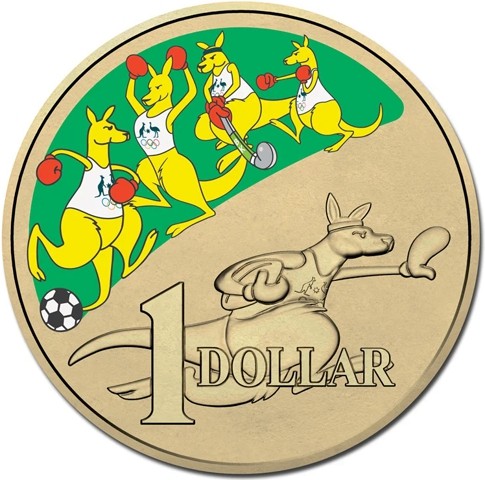 The reverse design depicted a gloved kangaroo in dynamic, action-packed rugby scene, running while clutching an oval rugby ball beneath a representation of the image of four red-gloved golden kangaroo on a green background as a symbol of the Australian fighting spirit (an Australian icon during America’s Cup in 1983) playing different games soccer, celebrating, hockey and boxing. The denomination "1 DOLLAR" below.