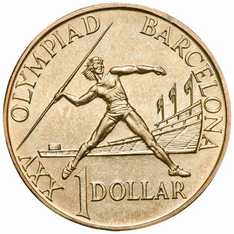 The reverse of coin depicts a female athlete in the act of throwing a javelin surrounding by the inscription "XXV OLYMPIAD BARCELONA." In the exergue, the face value 1 DOLLAR.