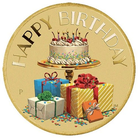 The coin's reverse design depicts a colored composition featuring four gift wrapped boxes, a birthday colorful cake adorned with colored birthday flamed candles and party confetti in color for birthday celebration. The design also includes the inscription ‘Happy Birthday’ around above. In the left field, The Perth Mint’s ‘P’ mintmark appears below and the designer's initials (JM) at the opposite, below right .