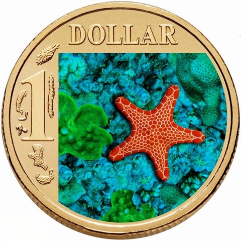 The reverse features a unique color design of a Biscuit Star which is usually a reddish-brown color with lighter markings, which helps it blend into their coral reef or sandy seabed habitats. The numeral "1" is surrounded by a Biscuit Star smorgasbord next to a pad printed image of a Biscuit Star.