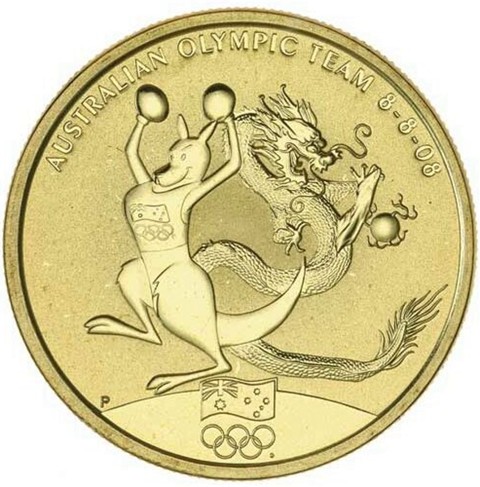 The coin's reverse shows the Australian Olympic Committee's official 'Flag and Rings' logo with an image of the Boxing Kangaroo and a Traditional Chinese Dragon pursuing a flaming pearl. As well as The Perth Mint’s ‘P’ mintmark below left and metal, purity and weight "1oz 999 SILVER” at the opposite, the inscription accompanied with date of beginning tournaments "AUSTRALIAN OLYMPIC TEAM 8-8-08" around above.
