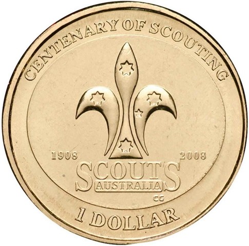 This one dollar depicts the Australian spirit flame, the Australian Scout symbol sculpted by Caitlin Goodall. This symbol resembles the international Scouting symbol, the fleur-de-lis incorporating the southern cross. The reverse states "Centenary of Scouting" around above divided by the symbol, the dates1908 2008 Scouts Australia, the denomination "1 Dollar" around below. Below the symbol, SCOUTS AUSTRALIA. In the right field below, the designer's initials (CG)