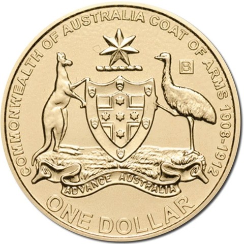 The reverse of the coin depicts elements of the original design from 1908. This Coat of Arms is the same as struck on some of our pre-decimal coinage such as the florin and the threepence prior to 1936, the kangaroo and emu supporting the shield on a grassy mound. A seven pointed star is depicted above with "Advance Australia" written in the ribbon device below, surrounded by the legends read "Commonwealth of Australia Coat of Arms 1908-1912" around above and denomination "One dollar" below. In the right field, the the B (for Brisbane) mint mark of the Royal Australian Mint above Emu.