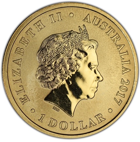 Fourth crowned portrait of HM Queen Elizabeth II facing right, wearing the Girls of Great Britain and Ireland tiara. surrounded by the inscriptions “ELIZABETH II,” “AUSTRALIA, 2017,” and the face value “1 DOLLAR.”