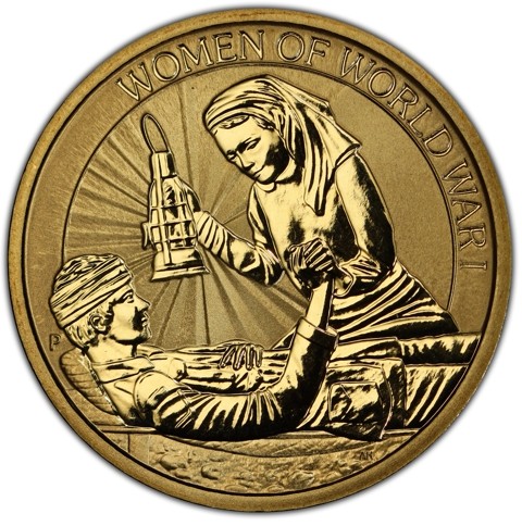 The reverse of the coin depicts an Australian nurse providing medical care to the a soldier and holding a lighting Gas Lanterns in the other hand. The inscription identify theme "WOMEN OF WORLD WAR I" around above right, In the left field, the Perth Mint's 'P' mintmark appears behind a soldier’s head and the designer's initials "AH" in tiny letters right below.