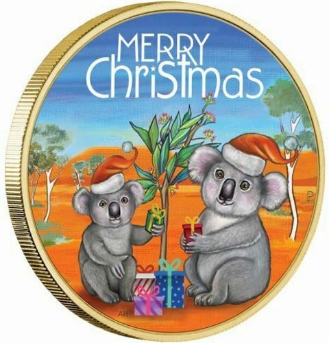 The coin’s reverse features two koalas gathered wearing Christmas hats exchanging presents under a eucalyptus tree against a backdrop of the Australian outback. The inscription MERRY CHRISTMAS. In the right field, the Perth Mint’s ‘P’ mintmark appears and the designer's initials (AH) are inscribed below left.