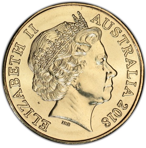 Fourth crowned portrait of HM Queen Elizabeth II facing right, wearing the Girls of Great Britain and Ireland tiara within a circle surrounded by the inscriptions “ELIZABETH II,” “AUSTRALIA, 2018,” and the face value “1 DOLLAR.”