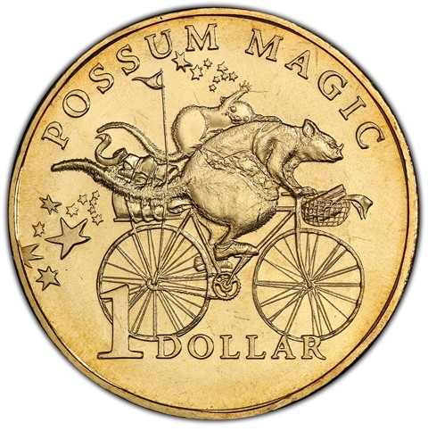 The reverse features an illustration of a scenes from the book, including Grandma Poss and Hush riding a bicycle around Australia looking for food to turn Hush visible again with the falling stars. The inscription of the series "POSSUM MAGIC" around above . The face value 1 DOLLAR is placed below.