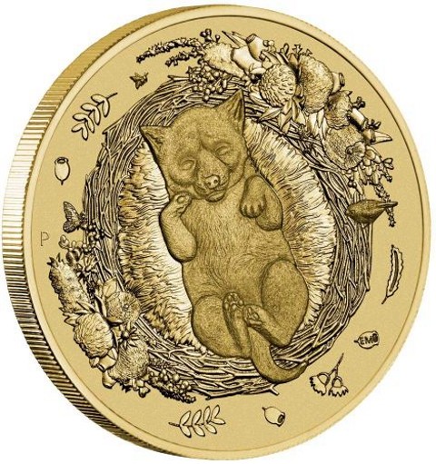 The coin depicts the cute canine asleep in a fleece-lined twig basket – a prop that has created a popular trend in newborn photography among parents all around the world. As well as Australian native flowers and wildlife, In the left field, the Perth Mint's 'P' mintmark appears and the designer's initials "EM" in tiny letters are incuse in a gumnut on the right.