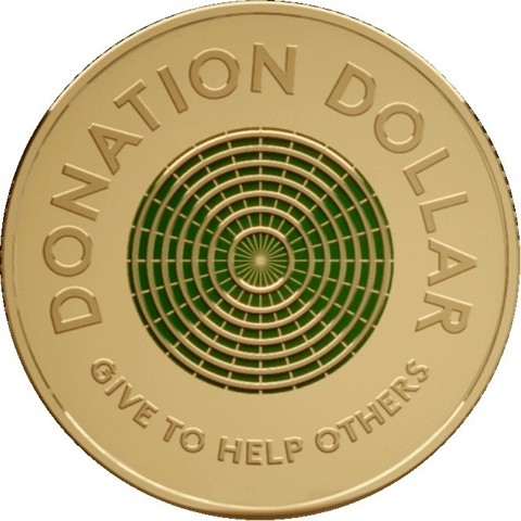 The reverse of the coin has several concentric lines at its center. From a central small circle, a number of green sectors radiate out over these concentric lines. The inscription "DONATION DOLLAR" around above, in smaller letters around below, "GIVE TO HELP OTHERS."