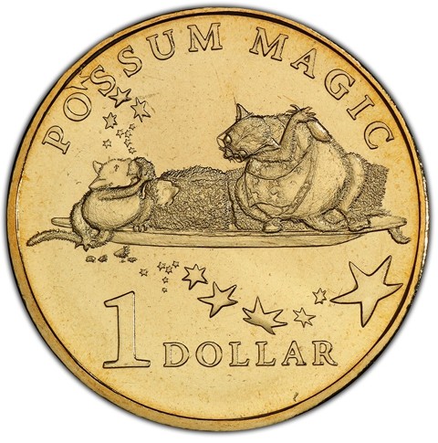 The reverse features an illustration of a scenes from the book, including Grandma Poss positioned over a branch extending across the coin horizontally watching Hush eat magic lamingtons which can help her become visible again with the falling stars. The inscription of the series "POSSUM MAGIC" around above . The face value 1 DOLLAR is placed below.
