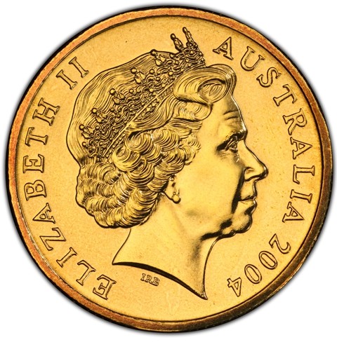 Fourth crowned portrait of HM Queen Elizabeth II facing right, wearing the Girls of Great Britain and Ireland tiara, framed by inscriptions ELIZABETH II, AUSTRALIA, and the coin's mintage year, "2004" below.