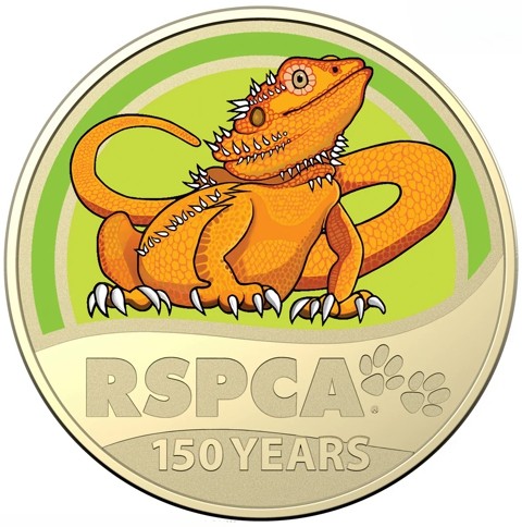 The reverse of the coin features pad-printed design of a Frilled-neck lizard reptile displays vibrant orange frill ready to defend itself against a light and dark green background. Below the abbreviation "RSPCA"- the name of the coin with footprint and anniversary.