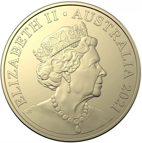 Fourth crowned portrait of HM Queen Elizabeth II facing right, wearing the Girls of Great Britain and Ireland tiara, framed by inscriptions ELIZABETH II, AUSTRALIA, and the coin's mintage year, "2021" below.