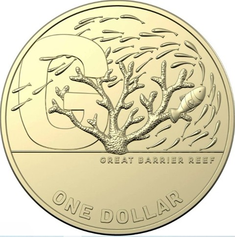 The coin's reverse features a large "G" at the left side, on the right, a school of fish surrounding a coral, the inscription "GREAT BARRIER REEF" - the name of the coin beginning with G below it. The face value “ONE DOLLAR” around below.
