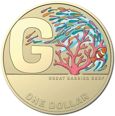 The coin's reverse features a large "G" at the left side, on the right, a pad-printed design of a colored school of fish with an orange and white clownfish against a blue background surrounding a pink coral, the inscription "GREAT BARRIER REEF" - the name of the coin beginning with G below it. The face value “ONE DOLLAR” around below.