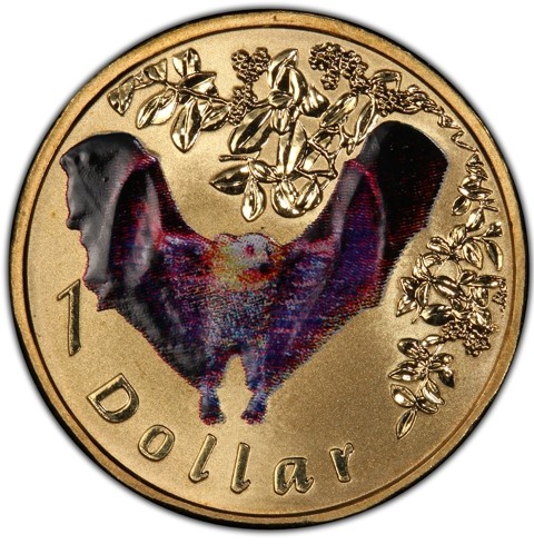 The reverse coin depicts a colored grey-headed flying fox (Pteropus poliocephalus), the largest bat in Australia, with a fig tree laden with fruit in the background, denomination and face value "1 Dollar" below.