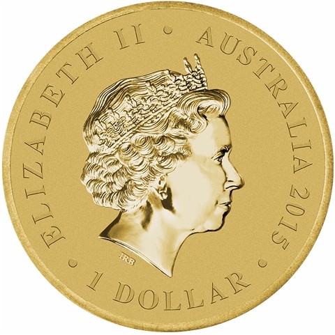 Fourth crowned portrait of HM Queen Elizabeth II facing right, wearing the Girls of Great Britain and Ireland tiara. surrounded by the inscriptions “ELIZABETH II,” “AUSTRALIA, 2015,” and the face value “1 DOLLAR.”