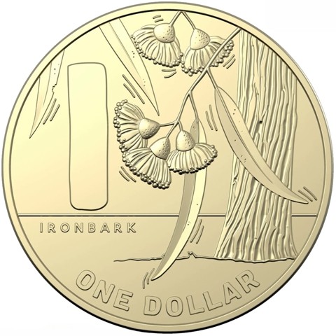 The coin's reverse features a large "I" at the left side, on the right, blossoms and leaves of the Australian native Mugga or Red Ironbark "Eucalyptus sideroxylon" foreground an Ironbark tree , the inscription "HOME AND AWAY" - the name of the coin beginning with I below it. The face value “ONE DOLLAR” around below.