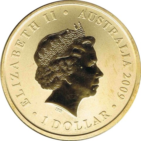Fourth crowned portrait of HM Queen Elizabeth II facing right, wearing the Girls of Great Britain and Ireland tiara. surrounded by the inscriptions “ELIZABETH II,” “AUSTRALIA,2009,” and the face value “1 DOLLAR.”