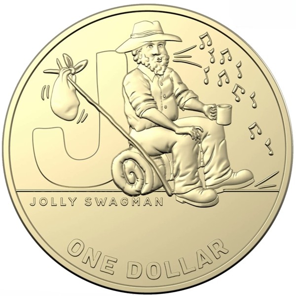 The coin's reverse features a large "J" at the left side, on the right, a jolly swagman seated singing the Waltzing Matilda song composed by Banjo Paterson along with musical notes, the inscription "JOLLY SWAGMAN" - the name of the coin beginning with J below it. The face value “ONE DOLLAR” around below.